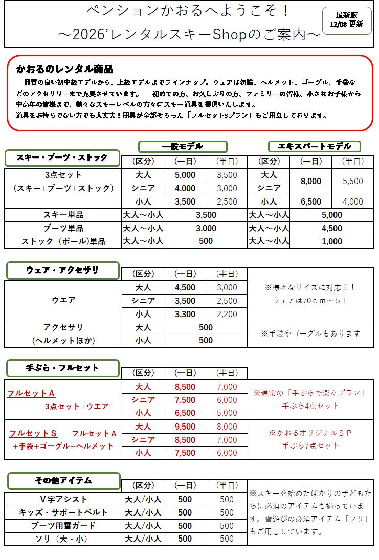 - 初めての方は、「スキー手ぶら8点セット」がおすすめ。